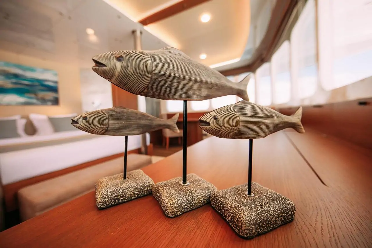 We bring to your attention our beautiful yacht Alice! This is a modern vessel, built using the most current shipbuilding technologies, and at the same time it is not devoid of striking style and unique character. The ideas of freedom and comfort have been successfully implemented here. Thanks to our decorator, the interior of the ship gives a feeling of calmness and comfort, you will feel like in an expensive boutique hotel. The interior uses mainly wood, fabric and other natural materials.