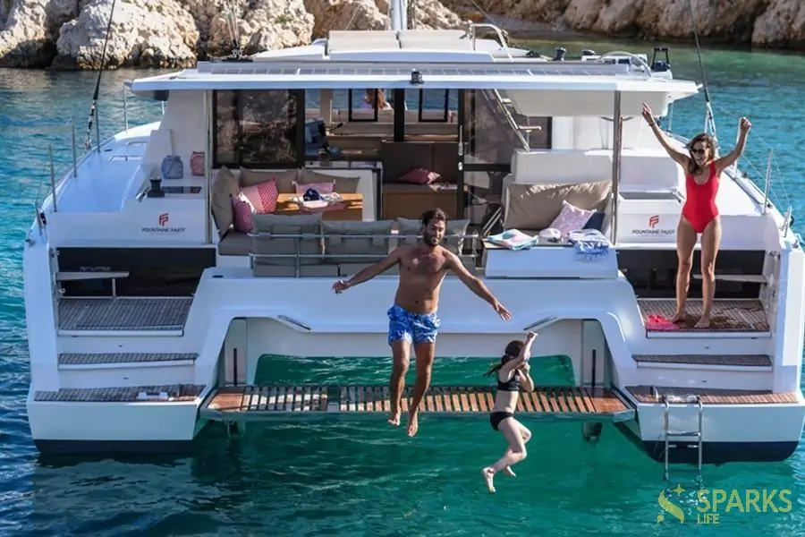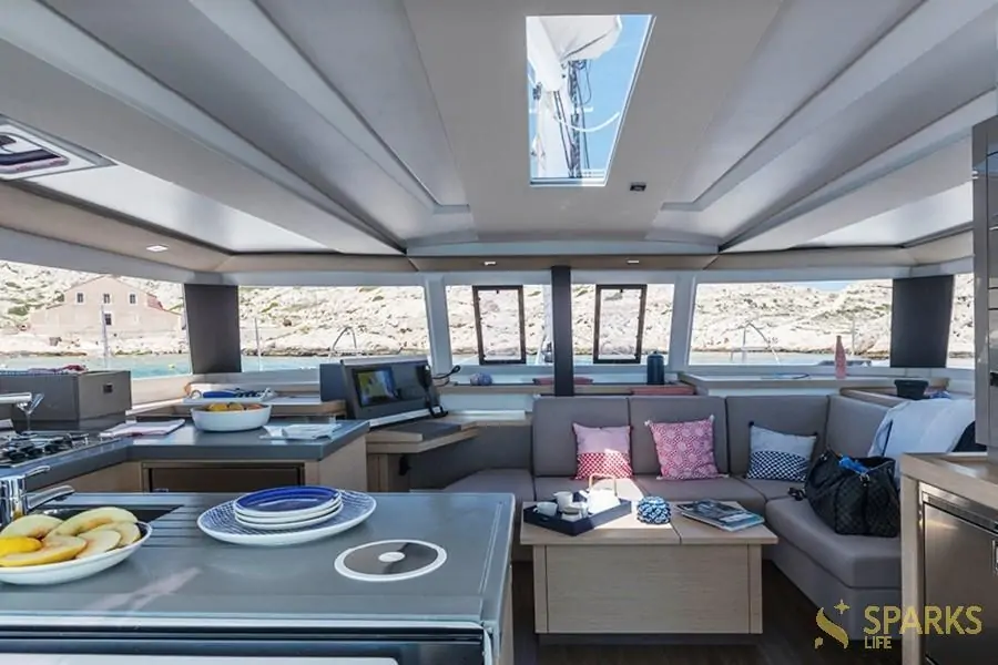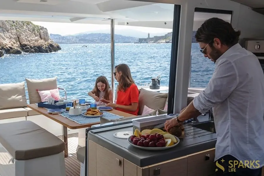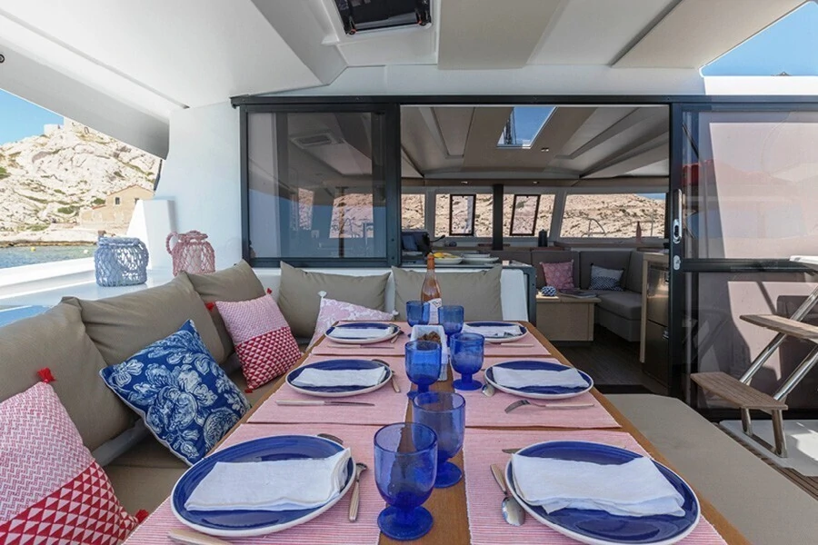 Палуба на Катамаран OSAYA – ідеальне місце, щоб насолоджуватися розслаблюючим морським відпочинком. Крім того, на борту Катамаран OSAYA є окремі каюти та санвузли, кухня та столики для невеликої компанії. Одним словом, ідеальний відпочинок вам забезпечений.