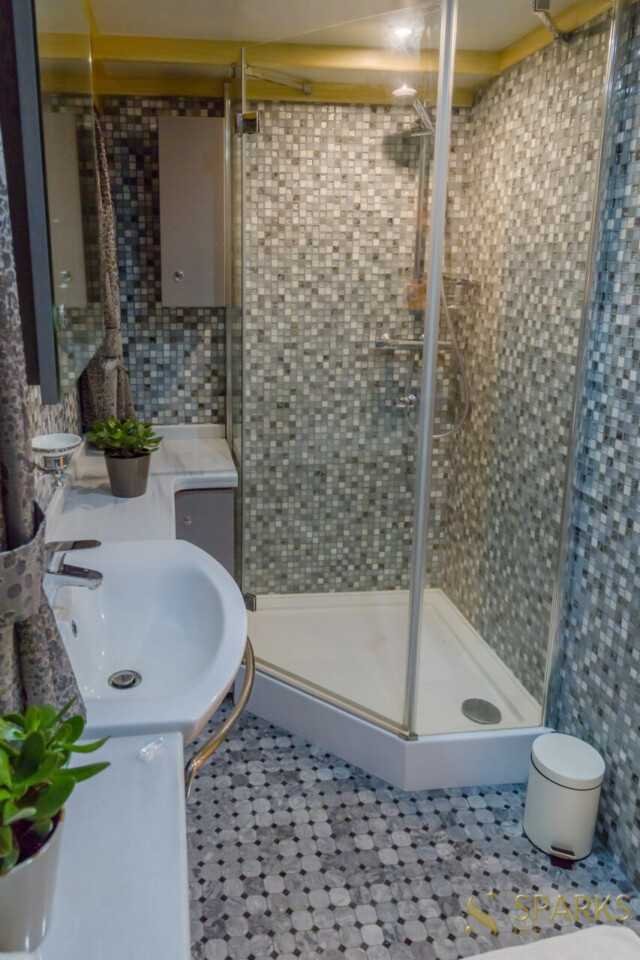 У всіх ванних кімнатах є телевізор зі світлодіодним підсвічуванням та аудіосистема, електричні туалети з прісною водою зі збірним баком, розетки для бритви на 240 В та мармурова підлога.
